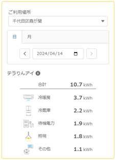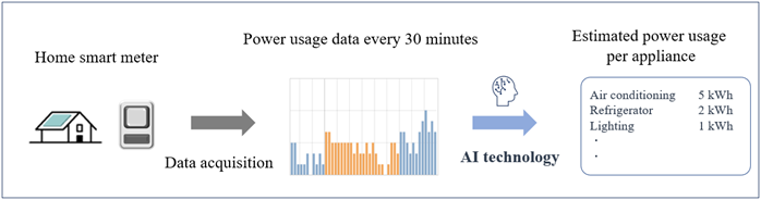 The TERARIN AI service visualizes power usage using AI technology to divide power usage data obtained every 30 minutes from household smart meters into five categories (air conditioning, refrigerator, standby power, lighting, and other devices) and estimate daily and device-specific power usage. It can also help reduce electricity costs and environmental impact by offering specific power-saving methods based on user power consumption patterns. This allows for an efficient use of energy that matches the customer's lifestyle.