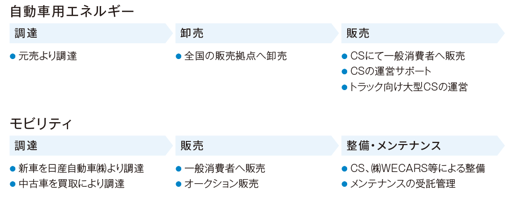 - ガソリン、灯油、軽油、重油、電力、自動車販売、生活・車関連商品サービスの販売、メンテナンス管理受託サービス、オートオークション