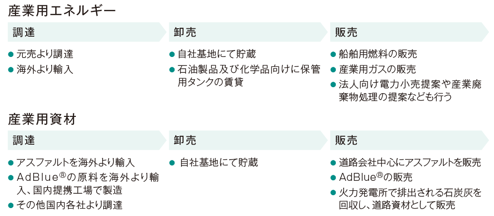 - アスファルト、船舶用燃料、石油製品輸出入、ターミナルタンク賃貸、法人向け給油カード、産業用ガス、ガス容器耐圧検査、AdBlue®、リニューアブル燃料、GTL燃料、エネルギーサービス事業、PCB回収処理斡旋